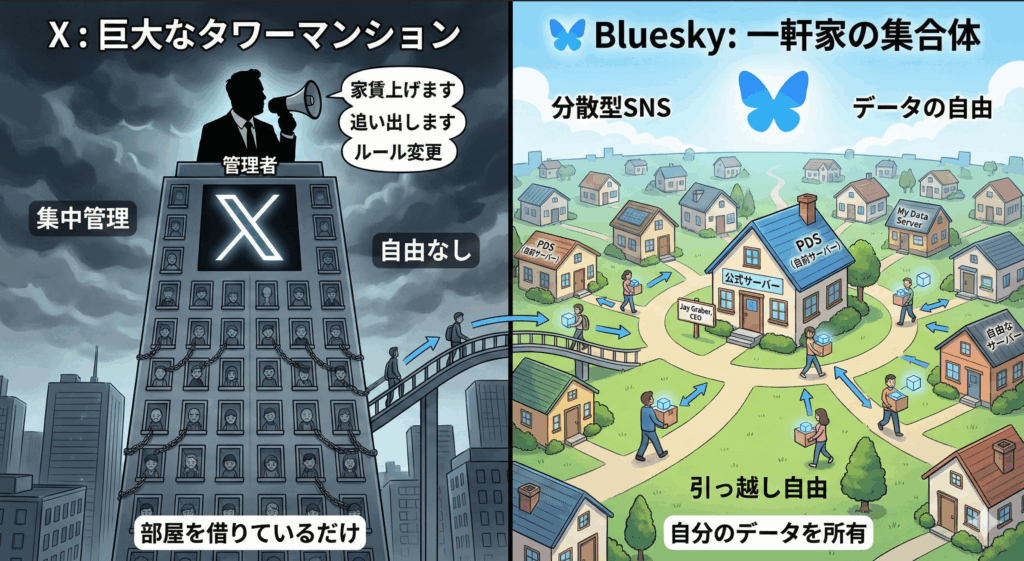 Xは「巨大なタワマン」、Blueskyは「一軒家の集合体」